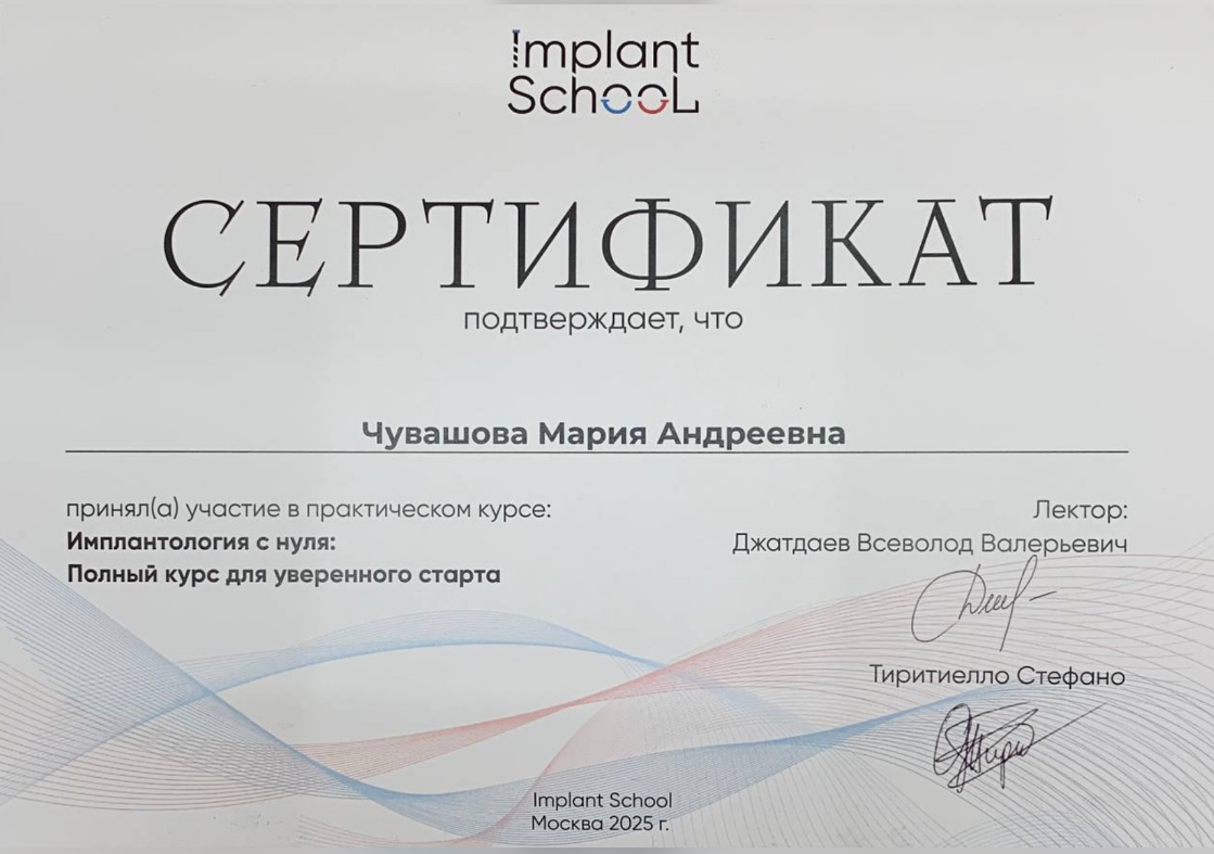 Спешим рассказать об очередном обучении уважаемого нашими пациентами хирурга - Чувашовой М.А. Мария Андреевна совсем недавно принимала участие в ПРАКТИЧЕСКОМ курсе: «Импланталогия с нуля. Полный курс для уверенного старта», сертификат тому подтверждение ✅